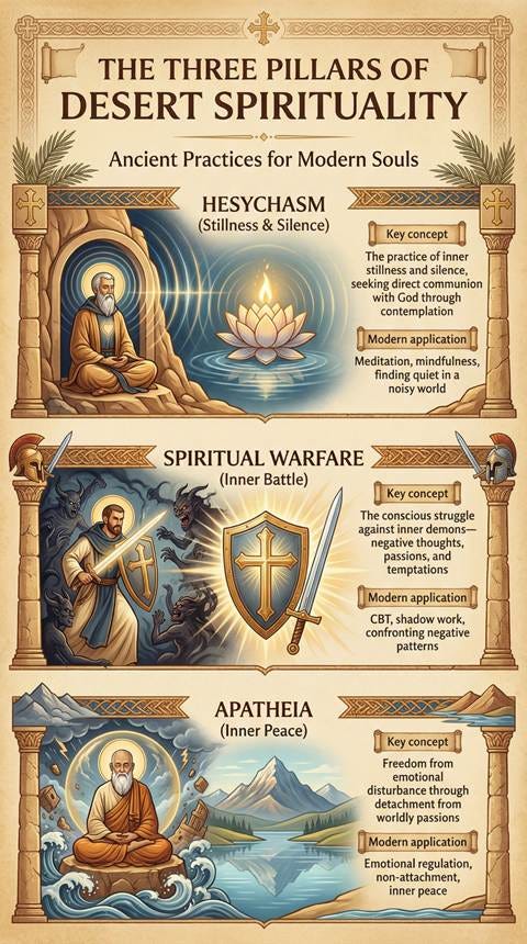According to The Desert Fathers, they believed that you cannot obtain inner peace by simply having more things in life - it is actually about taking away the extra unnecessary things from your life instead. They show us that the real source of strength will always come from being alone with Yourself; there are no stronger demons than the ones we create for ourselves through our minds. By embracing moments of silence, by bravely confronting our inner darkness, and by practicing a vigilant watchfulness over our thoughts, we can begin to build our own inner monastery, a place of unshakeable peace in the midst of our chaotic world.