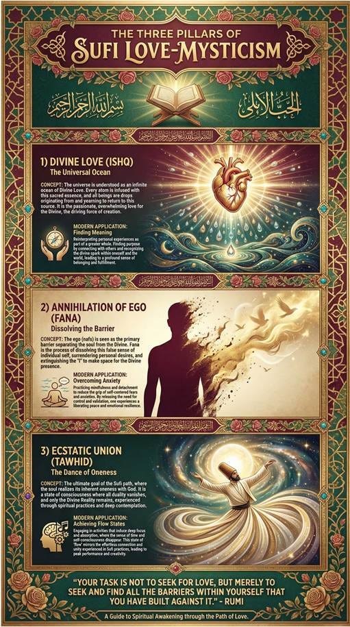 Ecstatic Union (Tawhid) Through practices like whirling, poetry, and music, the seeker can experience a temporary state of union with the Divine.