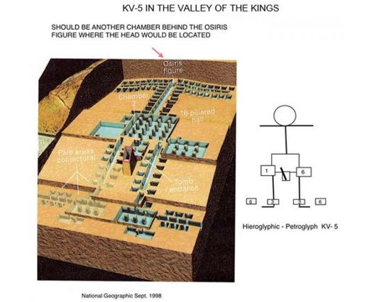 When I first saw the outline of KV-5 in the 1998 September issue of National Geographic, page 13, I saw a headless male figure. It is the largest underground chamber in the Valley of the Kings with over 120 rooms. If the figure represents Orion, his spear would be pointed at the burial site of Tutankhamun and the star Aldebaran, in the constellation of Taurus. In the middle ages Aldebaran was called Cortauri or The Heart of the Bull. The constellation of Orion should be located between the Pleiades and Sirius, if I am correct. So might KV-5 represent the Creator’s young nephew mentioned in the Hopi Creation Story?