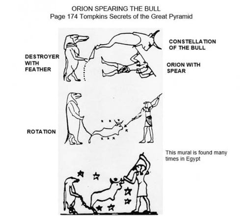 I am not an astronomer but believe that Orion moves up and down on the Meridian path and the constellations move on the Ecliptic Path. So at some point in time, the Spear of Orion will meet the star Aldebaran, the Heart of the Bull, as we move along our line or string. I believe this moment in time was documented; in the mural and Valley of the Kings in Egypt; in the location of the ancient ruins and villages of the Hopi in Arizona and New Mexico, and the pyramid complexes of China and Mexico, just for that reason.